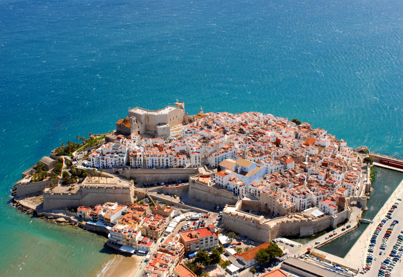 A atraente cidade de Peñíscola desenvolveu-se num imponente rochedo a 64 metros acima do mar azul, ligado ao continente por uma língua de areia. Este espectacular promontório domina uma paisagem de colinas próximas ao Mar Mediterrâneo.